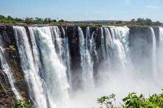 Tatsächlich sehen die Victoriafälle je nachdem, von welcher Landesseite man darauf blickt, immer anders aus. Die Wasserfälle speisen sich aus dem Sambesi-Fluss, dem viertlängsten Fluss Afrikas. Er trennt Sambia von Simbabwe und schneidet an den Victoriafällen tief in das ebene Land ein. In der Regenzeit, also zwischen November und März, wenn der Fluss das meiste Wasser führt, entsteht dort der größte Wasservorhang der Welt, gemessen an der Höhe und Breite.