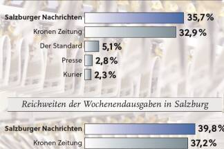 Die SN können sich aber auch über weitere Ergebnisse der Media-Analyse freuen. Im Bundesland schafften die "Salzburger Nachrichten" eine Reichweite von 35,7 Prozent. Zum Vergleich: Die "Kronen Zeitung" kam im Mittelwert auf 32,9 Prozent. Für die SN werden 166.000 Leser ausgewiesen, bei der "Krone" sind es 153.000. Im Zentralraum, bestehend aus Stadt Salzburg, Flachgau und Tennengau, sind die "Salzburger Nachrichten" mit 40,9 Prozent klar die Nummer eins; die "Krone" kommt auf 28,3 Prozent. Traditionell stark sind die "Salzburger Nachrichten" in den höheren Bildungsschichten: 44,9 Prozent der Salzburger in der sogenannten A- und B-Schicht greifen zu den SN. Im regionalen Wochenzeitungsmarkt konnte indessen die "Salzburger Woche" ihre Reichweite von 45,6 auf 47,4 Prozent steigern.