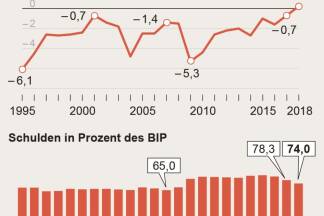 Die niedrigeren Zinsprognosen und die nach wie vor stabile Beschäftigung hingegen spielen dem Finanzminister in die Hände, beide Faktoren entlasten das Budget um 400 Millionen. Sodass in Summe ein Defizit von 1,2 Milliarden Euro erwartet wird. "Gesamtstaatlich muss Österreich einen negativen Maastricht-Saldo nach Brüssel melden", heißt es in einer Erklärung des Finanzministeriums. Dieser ergibt sich aus dem Defizit im Bund (0,3 Prozent des Bruttoinlandsprodukts) und den Überschüssen der Länder, Gemeinden und Sozialversicherungsträger (0,2 Prozent des BIP), was einem Defizit von 0,1 Prozent gleichkommt.
