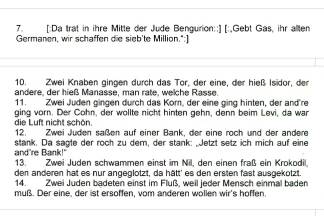 Weitere Textproben: "Zwei Juden badeten einst im Fluss, weil jeder Mensch einmal baden muss. Der eine, der ist ersoffen, vom anderen wollen wir's hoffen.", Oder: "Zwei Juden saßen auf einer Bank, der eine roch und der andere stank..."