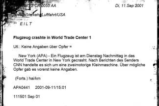 Indes sendet CNN die ersten Bilder einer permanenten Kamera vom brennenden 110-stöckigen Nordturm unter den Breaking News: "Flugzeug in Turm des World Trade Centers gestürzt". Da ist es gerade 8.49 Uhr in Manhattan.