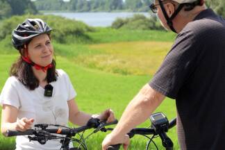 Ich bin mit Andrea Zinser auf der Naturschatzkammern-Tour "Fürstliche Seen" unterwegs. Als Verantwortliche für die RadReiseRegion kennt sie alle Highlights wie ihre Westentasche: "Hier reihen sich Seen und Weiher und Schlösser aneinander, und zudem lässt sich ein Blick auf die imposante Waldburg erhaschen".