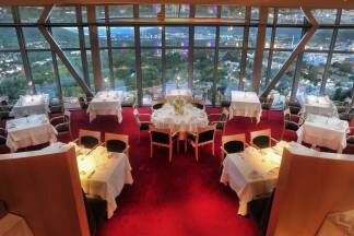 Hier habe ich mit feinem Ausblick über Jena übernachtet: Das Scala Turm Hotel, der zweithöchste Hotelturm Deutschlands, bietet moderne Zimmer (mit netten Lichtstimmungs-Variationen per Knopfdruck) und ein gepflegtes Gourmet-Essen in 120 m Höhe mit Blick über die Stadt.