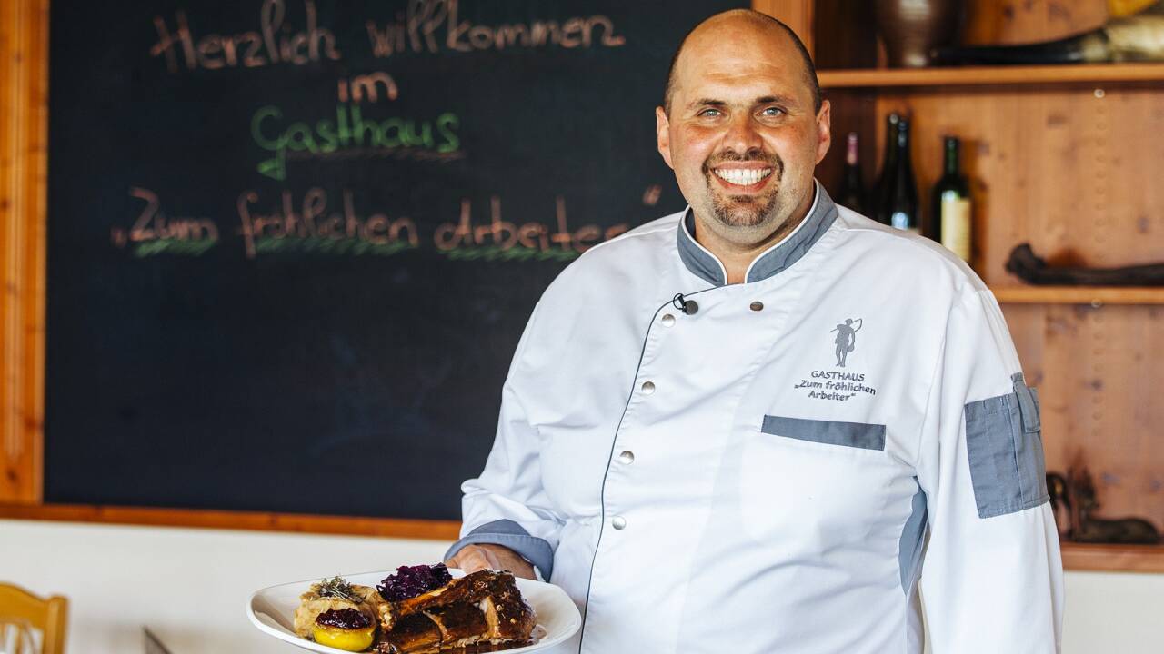 Hannes Tschida verwöhnt die Gäste seines seit 1923 familiengeführten Gasthauses "Zum fröhlichen Arbeiter" mit regionalen Köstlichkeiten. Der Name stammt aus jener Zeit, als hier die Arbeiter vom damaligen Apetloner Meierhof ihren Lohn ausbezahlt bekamen und gut gelaunt mit einen Glas Wein anstießen.