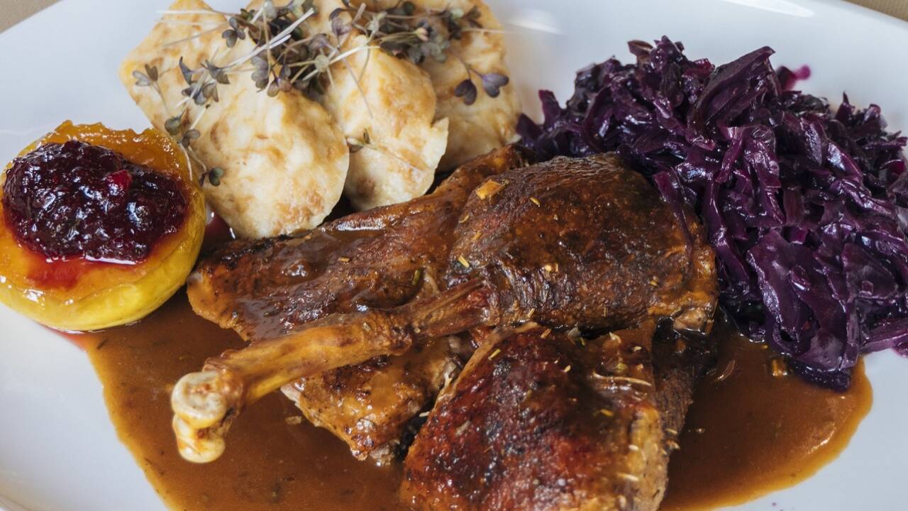 Die Gans tranchieren und alles auf einem Teller anrichten.