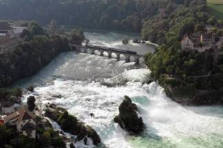 Eines der ganz großen Highlights jeder Bodensee-Rundreise ist der größte Wasserfall Europas. "Rhyfall" nennen ihn die Schweizer. Mehr als 20 Meter ist er hoch und 150 Meter breit. Wie eine Spielzeugeisenbahn schlängelt sich gerade ein Zug auf der imposanten Brückenkonstruktion über den Rheinfall - buchstäblich Atem beraubend. Zum Zuschauen, der Radweg führt bequem dran vorbei. Sehen Sie selbst im Video.