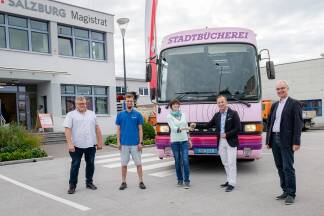 32 Jahre lang war der alte Bücherbus in der Stadt Salzburg im Einsatz. Am Freitag hat Bürgermeister-Stellvertreter Bernhard Auinger, ressortzuständig für Kultur, Wissen und Bildung, im städtischen Bauhof Mitarbeitern der Fahrbibliotheken im Berliner Bezirk Steglitz-Zehlendorf die Schlüssel für den trotz seines Alters noch fahrtüchtigen Bus übergeben. Er wird dort anstelle eines ausgefallenen Bücherbusses durch den Bezirk touren.