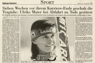 Maier war 1994 - drei Jahre nach dem Todessturz von Gernot Reinstadler in Wengen - mit Startnummer 32 nach einem Verschneider gegen eine auf der Piste befindliche Zeitmessvorrichtung geschleudert und dabei tödlich verletzt worden. Die Rauriserin gilt nach dem atypischen Sturz als erstes Opfer der damals neuen Carving-Technologie, nachdem gerade stärker taillierte Ski aufgekommen waren.