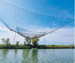 Es ist ein kleines Refugium, das der wortkarge Daniele liebevoll pflegt, der Garten mit seinen Schattenplätzchen sowie der Food Truck mit großem Weinkühlschrank, in dem Köstliches aus fangfrischem Fisch gebrutzelt wird. Sardinen, Äschen, manchmal ein Wolfsbarsch, ein paar Ährenfische. Doch vor dem Schnabulieren heißt es Schwimmwesten anlegen und ins Kanu klettern. Die Fischerhütte selbst liegt direkt an der Mündung des Flusses Stella in die Lagune von Marano - und mitten im Naturreservat, das ein ausgewiesenes Vogelschutzgebiet ist. Die paar Gäste, die die Kanutour gebucht haben, klettern über den Steg in die Zweierboote, hoch über ihnen spannt sich in elegantem Bogen das Senknetz. An seinem tiefsten Punkt: die Reuse, wie ein Wurmfortsatz, in dem sich nach dem Hochziehen die Fische sammeln. Dann fährt Daniele mit seinem Boot genau unter die Reuse und öffnet sie. Der Fang purzelt in einen Eimer.