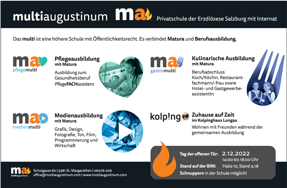 ST. MARGARETHEN. Das multiaugustinum ist eine Katholische Privatschule im Salzburger Lungau, wo junge Menschen nicht nur eine Schule besuchen, sondern fürs Leben lernen. Was sich andere als Motto anheften, wird bei uns ganz selbstverständlich gelebt: Wir sind eine Schulgemeinschaft, in der der Mensch mit all seinen Bedürfnissen im Mittelpunkt steht. Lernen ist hier eingebettet in ein wertschätzendes Miteinander, das im Schul- sowie Internatsleben spürbar ist. Fürs Leben lernen bedeutet bei uns, dass neben einer fundierten Allgemeinbildung genauso soziale und praktische Fähigkeiten erworben und gefördert werden. In unseren drei Ausbildungszweigen werden junge Menschen in ihrer Persönlichkeit und ihren individuellen Fähigkeiten gestärkt und umfassend auf das Berufsleben mit all seinen Herausforderungen vorbereitet.