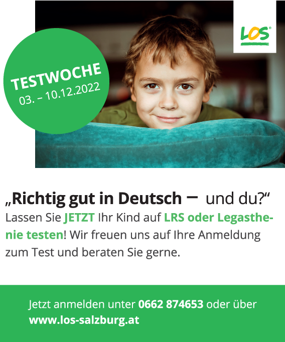 Das LOS in Salzburg lädt zum kostenlosen Rechtschreibtest vom 03.12. - 10.12.2022 ein. Unter 0662 874653 oder auf www.los-salzburg.at können sich betroffene Eltern informieren und einen Beratungstermin vereinbaren.