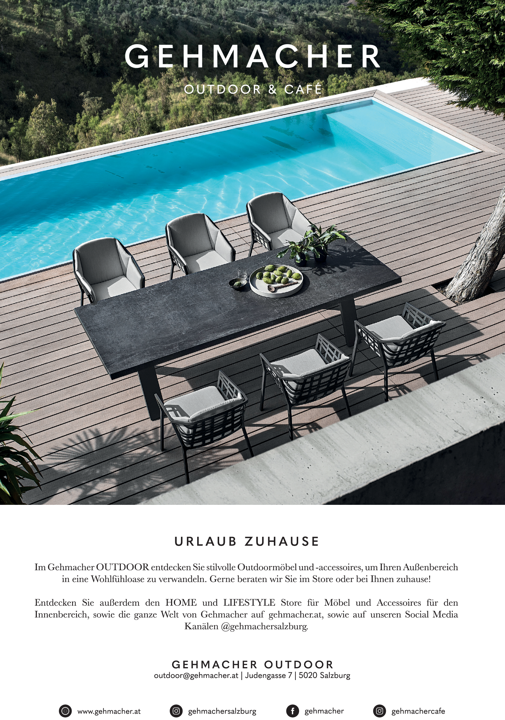 Genießen Sie den Sommer zu Hause mit unseren Gartenmöbeln für den Außenbereich, statten Sie sich mit festlicher Kleidung für die Festspiele oder gemütlich für die Grillparty aus oder genießen Sie unser veganes Cashew-Eis oder unsere kalten Kaffeespezialitäten im Gehmacher Café, während Sie einen gemütlichen Stadtbummel machen. Wir freuen uns darauf, Sie in unseren acht Geschäften willkommen heißen zu dürfen und ,,Schönheit zu leben"!