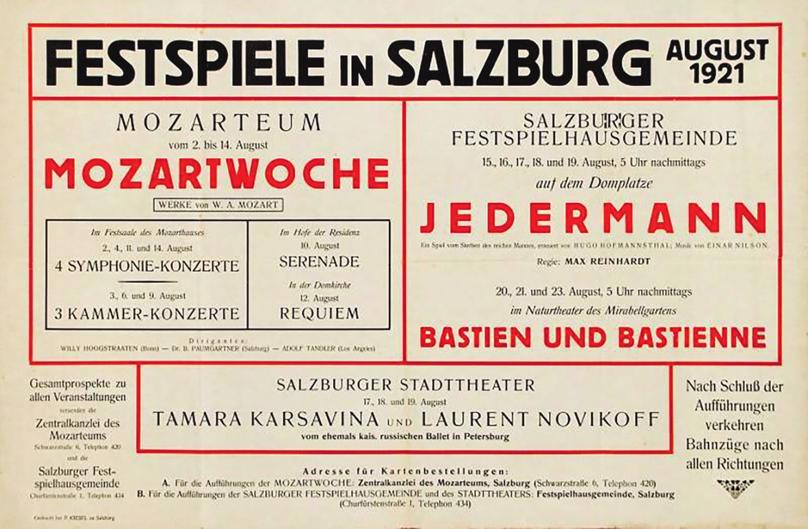 Im September 1918 - zwei Monate vor dem Waffenstillstand - entwarf Hugo von Hofmannsthal einen kühnen Plan für den Wiederaufbau Europas: „Dass gerade von Österreich aus es möglich sein wird, die zerrissenen Fäden der europäischen Kulturgemeinschaft wieder anzuknüpfen und in keinem Zeichen eher als im Zeichen der Musik und des Theaters. Das [könnte] Salzburg für die darstellende Kunst werden." Obwohl der erste „Jedermann" im August 1920 vor allem deutsches und österreichisches Publikum anlockte, spornte dies zu weiterem Handeln an: Mozarteum, Landestheater und Salzburger Festspielhausgemeinde schlossen sich 1921 zur Arbeitsgemeinschaft für „Festspiele in Salzburg" zusammen.