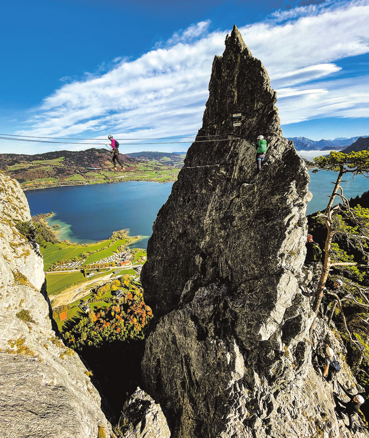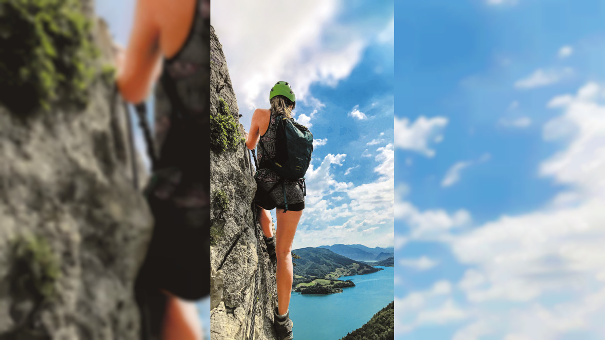 Schluck. Oje. Hoffentlich geht das gut. Das sind in etwa die ersten Gedanken, die mir durch den Kopf gehen, als wir am Fuße der Drachenwand stehen. Die Drachenwand liegt am oberösterreichischen Mondsee, nur unweit der Grenze zum Bundesland Salzburg. Nach einer kurzen Strecke des Wanderns geht es schon ans Eingemachte: Das Klettersteigset gezückt, gilt es sich selbst entlang der fix installierten Stahlseile zu sichern.
