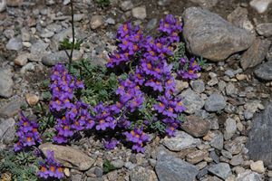 Die blauviolette Blütenfarbe des Alpen-Leinkrautes mit den innen gelben Rachenblüten stellt einen schönen Kontrast zum Grau der pflanzenarmen Schutthalden dar. Die Pflanze gehört zu den sog. Schuttüberkriechern, denn ihre beblätterten Triebe liegen auf dem Schutt. In Flusstälern wird das Alpen-Leinkraut oft weit nach unten geschwemmt.