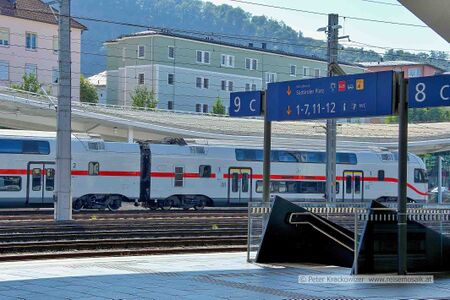 Ein Zug der Österreichischen Bundesbahnen verlässt den Bahnhof Neumarkt am Wallersee in Richtung Salzburg Hauptbahnhof.