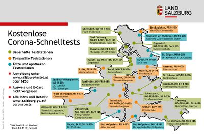 - Gleich bleiben ab 8. Februar die 14 permanenten gratis-Teststationen in Oberndorf bei Salzburg, Stadt Salzburg (Messezentrum), Oberalm, Hallein, Kuchl, Saalfelden am Steinernen Meer, Mittersill, Zell am See, St. Michael im Lungau, Tamsweg, Schwarzach im Pongau, Radstadt, St. Johann im Pongau und Eugendorf. Öffnungszeiten und Adressen unter www.salzburg.gv.at/coronatests.