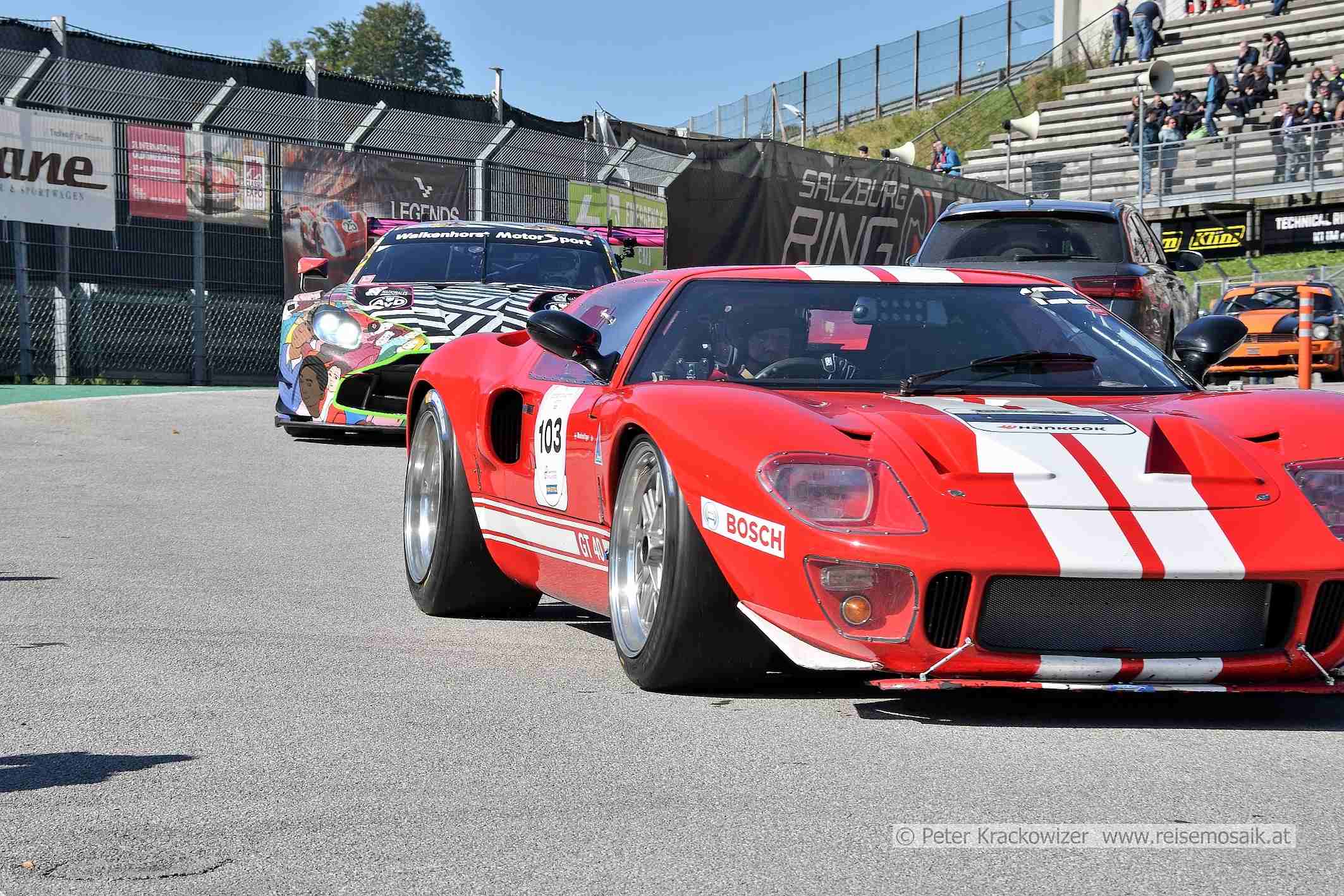 Legends Grand Prix 2025 Salzburgring Rennwagen. Nr. 103 Ford GT 40, Baujahr 1975, 450 PS, 5700 cm³, Fahrer Manfred und Heidemarie Irger, dahinter Nr. 97, Aston Martin Vantage GT3, Baujahr 2025, 540 PS, 400 cm³, Fahrer Christian Danner