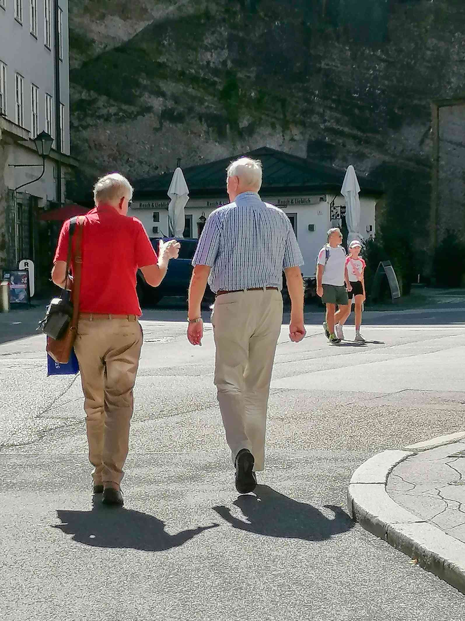 - Otto Holzapfel (rechts) und Peter Krackowizer im Toscaninihof bei einem Rundgang auf den Spuren von Mitgliedern der Familie Spängler.