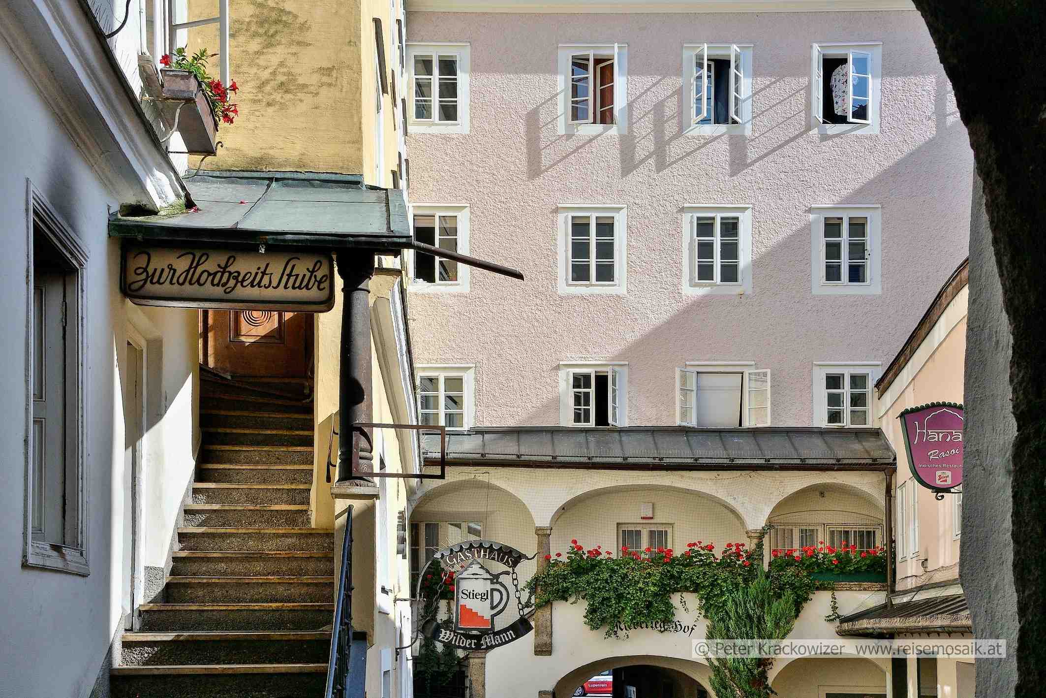 - Aufgang in einen der Gasträume des Gasthauses "Zum Wilden Mann" im Niederleg-Durchhaus in der Salzburger Altstadt. Im Hintergrund das der ehemaligen Niederlage im Niederleg-Hof.