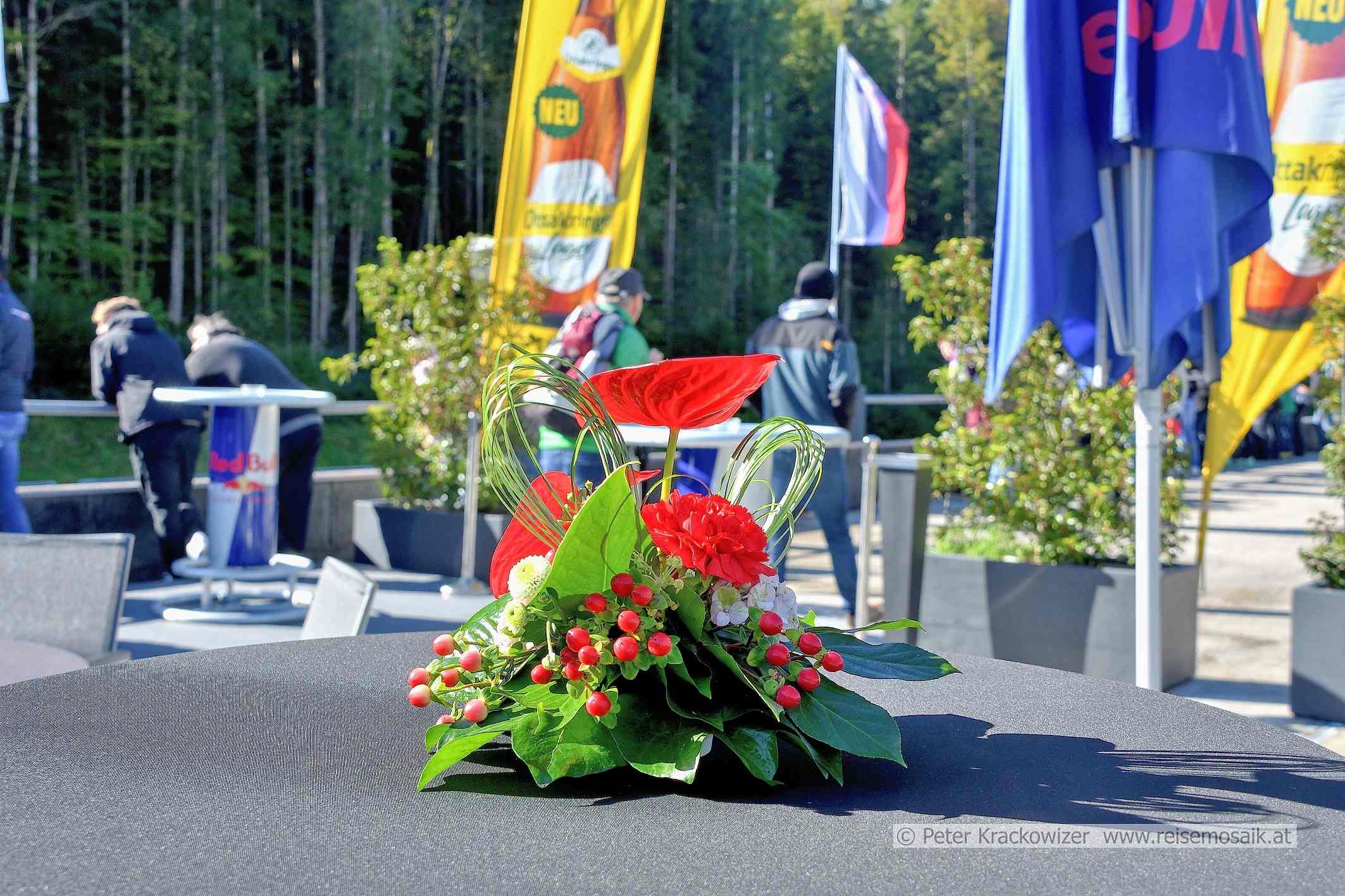- Legends Grand Prix 2025 Salzburgring Boxen. Tischblumenschmuck im VIP-Bereich.
