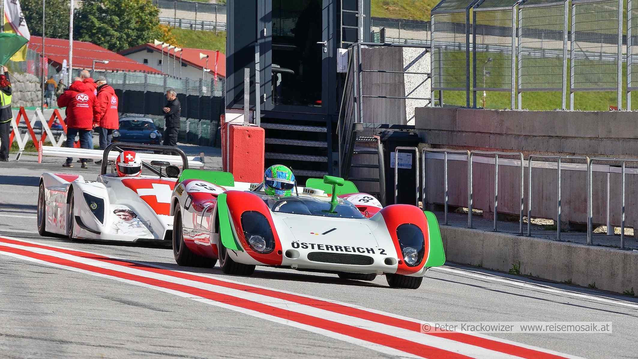 - Legends Grand Prix 2025 Salzburgring Boxen. Nr. 33 Porsche 908/02 Spyder, Baujahr 1969, 350 PS, Fahrer GT Masters-Rennfahrer Marco Seefried. Mit diesem Porsche waren Rolf Stommelen, Joe Buzzetta, Kurt Ahrens und Vic Elford mehrfach 1969 und 1970 erfolgreich. Dahinter Nr. 25 Eduard Zaugg aus der Schweiz, der einen Pedrazza PRC S4 Baujahr 2005 mit 420 PS fährt.