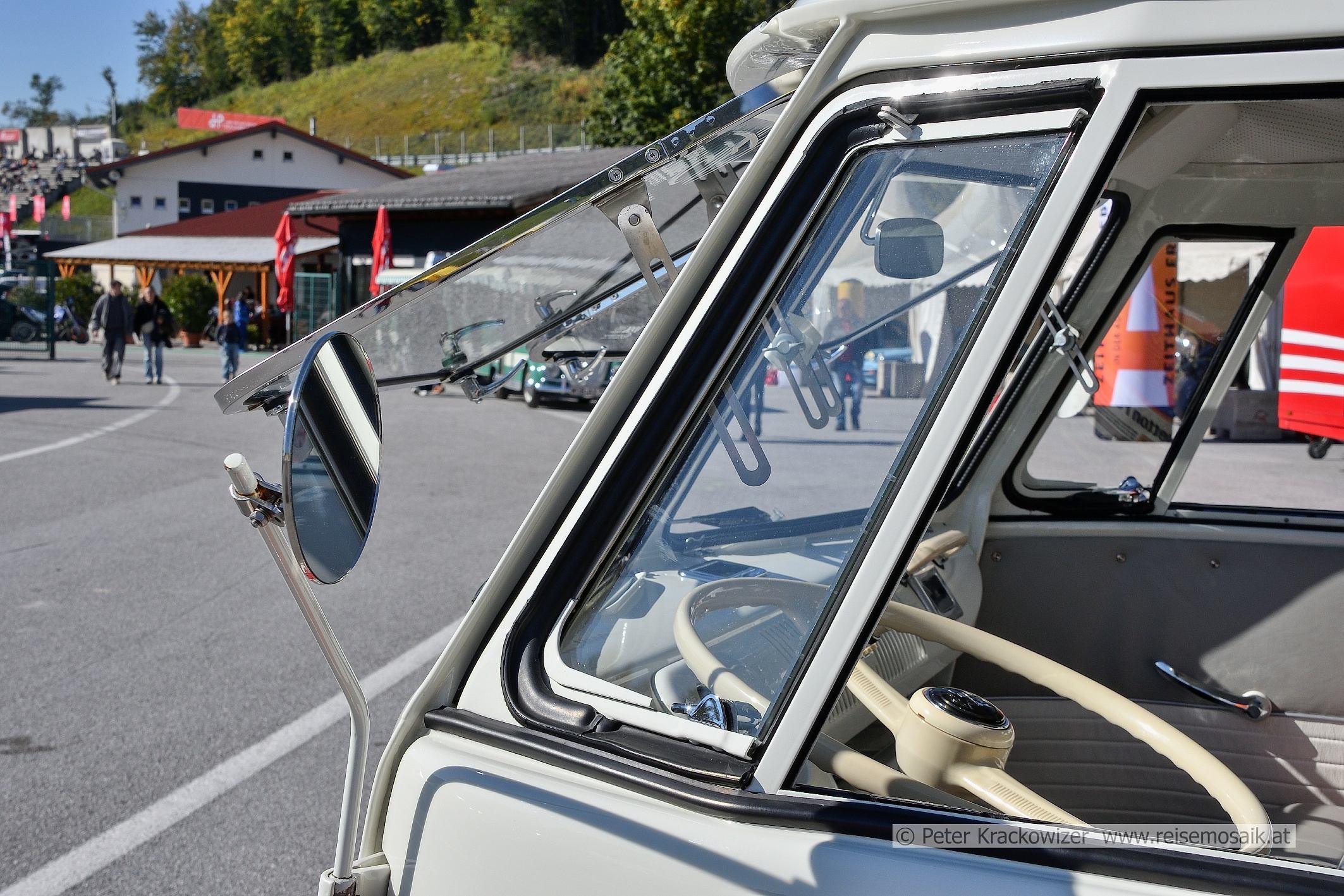 - Legends Grand Prix 2025 Salzburgring Fahrerlager. Hans-Peter Porsche Traumwerk. Aufklappbare Windschutzscheibe des VW-Busses.