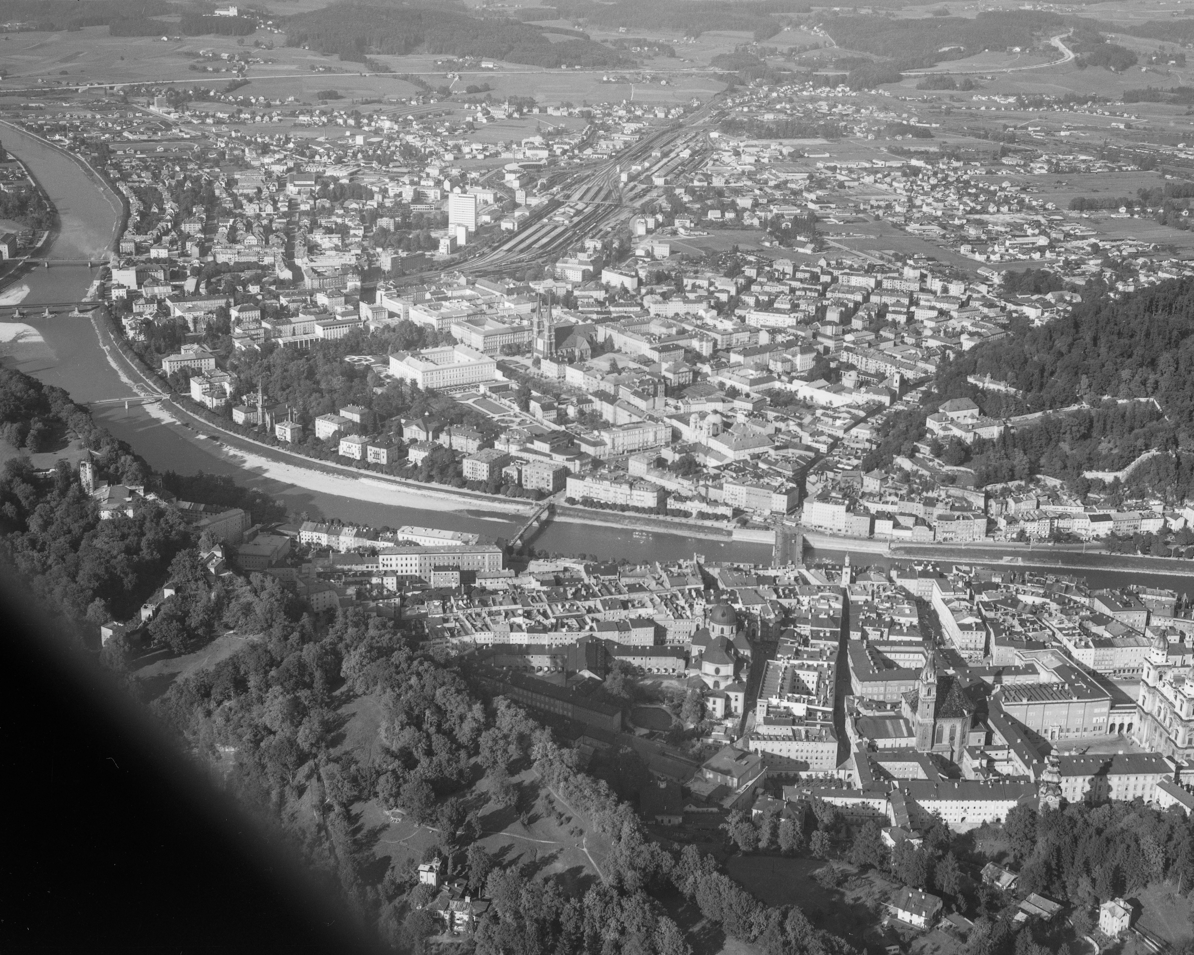 - Blick auf die Stadt Salzburg, an unteren Bildrand der Mönchsberg, am rechten Bildrand der Kapuzinerberg. Im unteren Bildteil die Salzburger Altstadt, darüber die Neustadt, Elisabeth-Vorstadt und rechts dann Schallmoos.