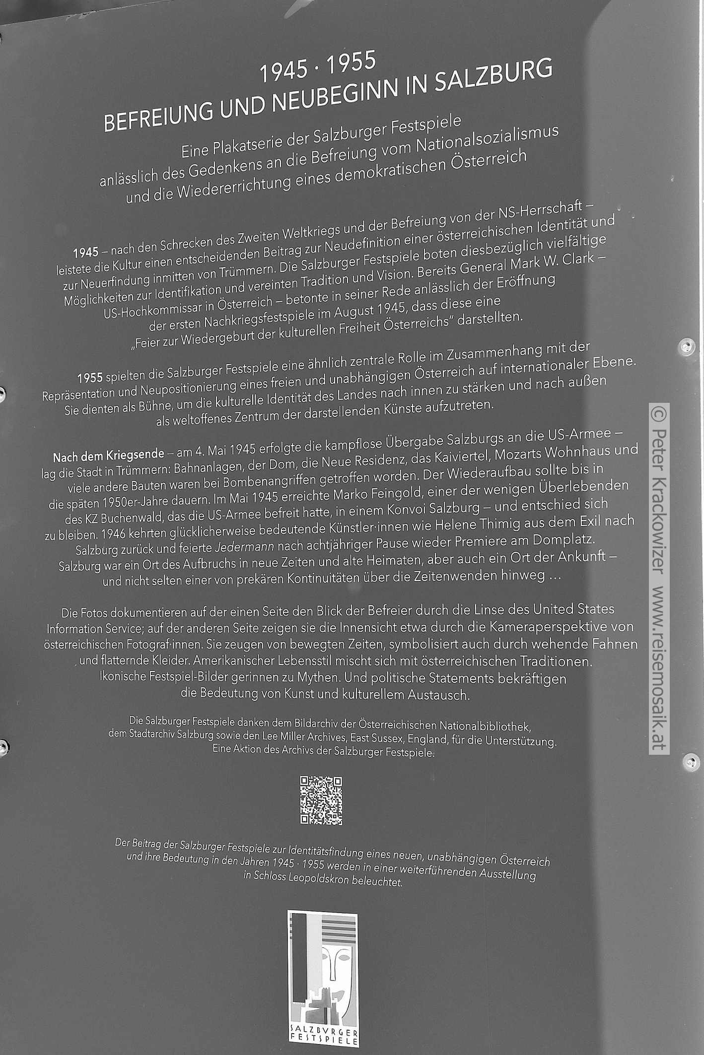 - Befreiung und Neubeginn in Salzburg 1945 bis 1955, Plakatserie der Salzburger Festspiele auf dem Marko-Feingold-Steg im Sommer 2025. Beschreibung.