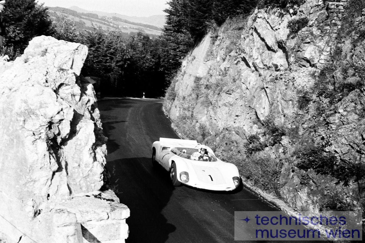 Gaisbergrennen 1967 am 3. September, Nr. 1 - Gerhard Mitter, "Porsche Prototyp", Gesamtzeit 07:22,59 min. und Zweiter in der Klasse der Sportwagen Prototypen, hier zwischen den Felsen kurz vor dem Parkplatz Gersberg.