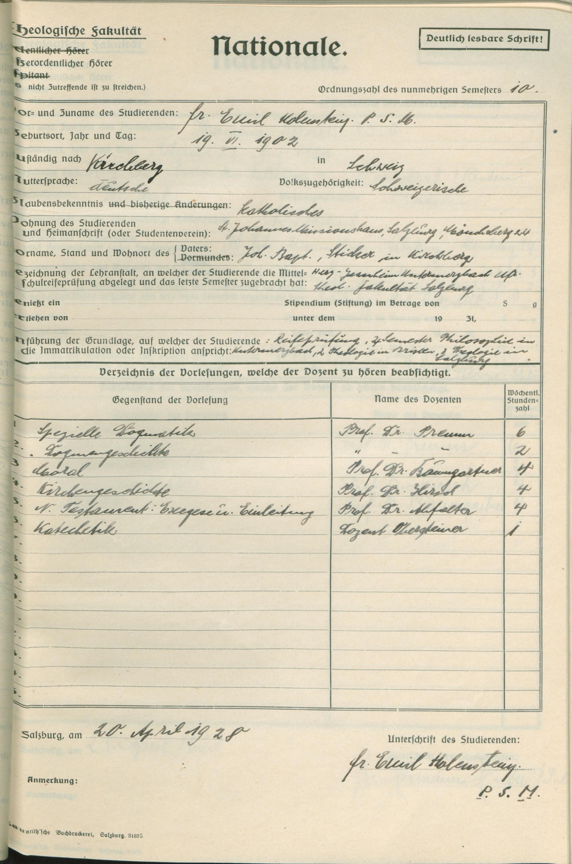 - Nationale von Emil Holenstein(20.04.1928), Universitätsarchiv Salzburg, FA 118 (ePLUS – Digitale Bestände der Universität Salzburg)