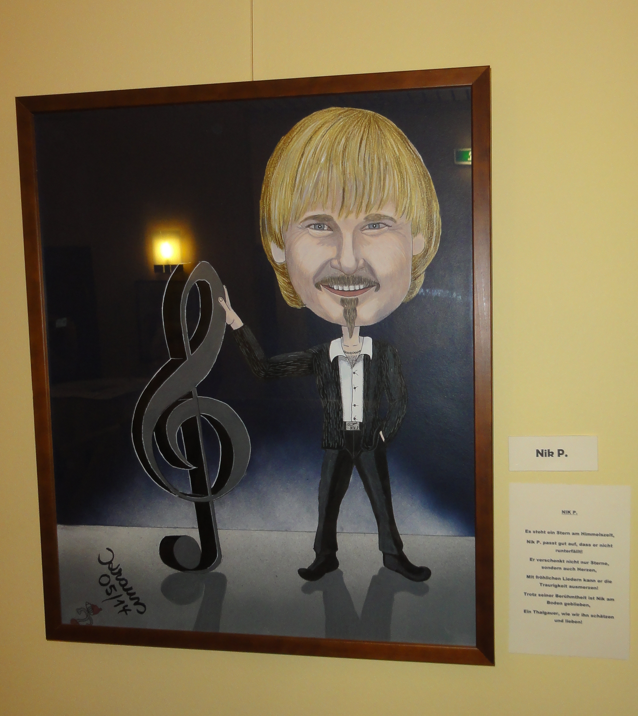 - Porträt von Nik P. in der Karrkaturenaustellung von Axel Wilhelm Krauss im Thalgauer Gemeindeamt am 25.9.2014