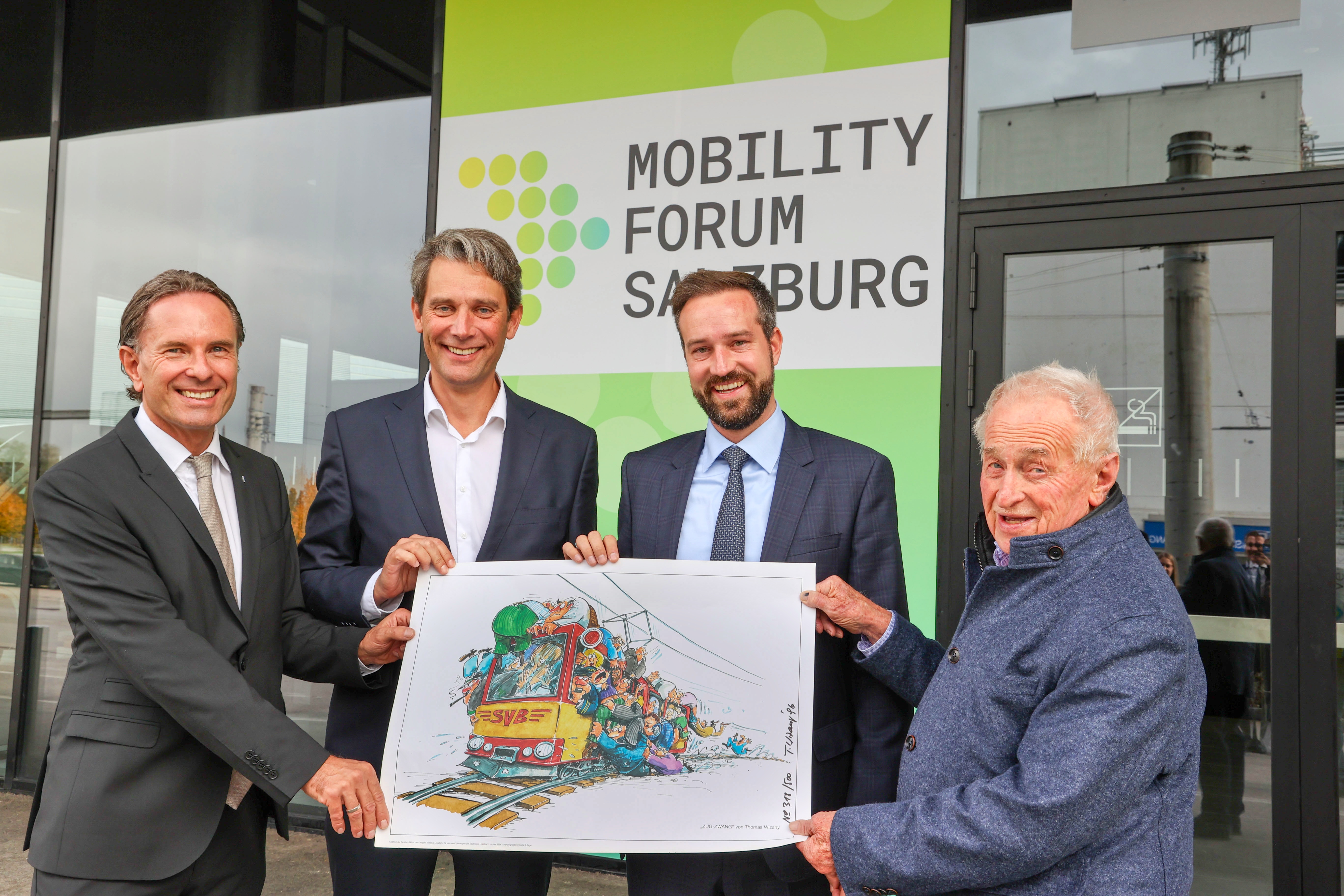 - Salzburger Verkehrstage 2022 im Messezentrum Salzburg v.l. Christian Strasser ("Salzburger Nachrichten"), Johannes Gfrerer (Geschäftsführer Salzburger Verkehrsverbund), Stefan Schnöll (Landesrat Salzburg) und Peter Haibach (Obmann Verein Forum Mobil); mit einer Karikatur von Thomas Wizany.