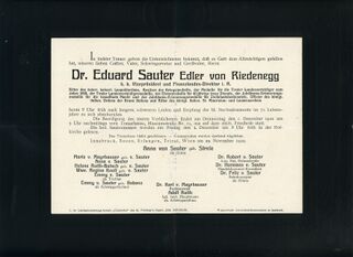 - Todesanzeige 1910 für den Dr. Eduard Sauter von Riedenegg, Sohn von Josefine und Andreas Sauter, die am selben Tag starben.