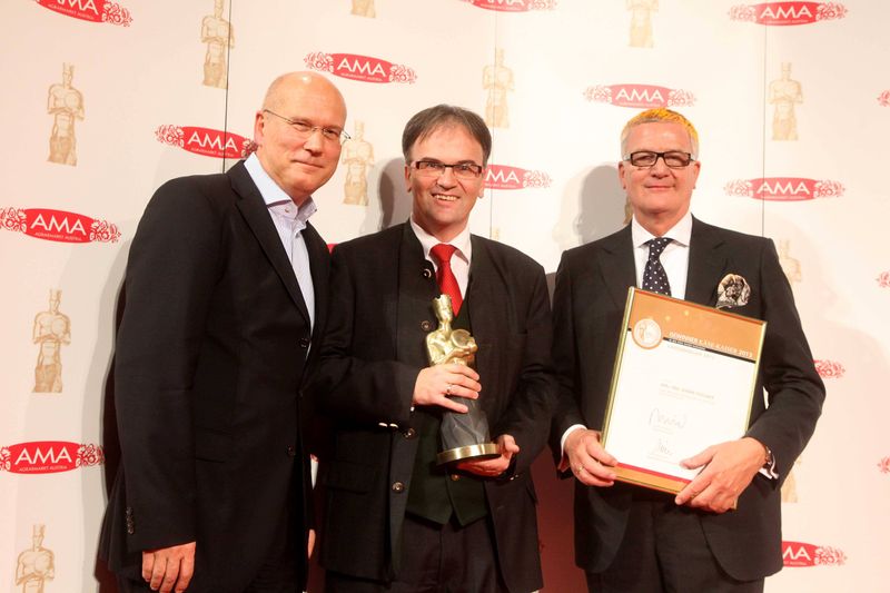 - Othmar Stellner bei der Käse Kaiser Gala 2013 der Agrar Markt Austria: Frank Hensel (Vorstandsvorsitzender REWE AG), Dipl.- Käsesommelier an Schulen, Küchenmeister Othmar Stellner, Dr. Stephan Mikinovic (AMA Marketing).
