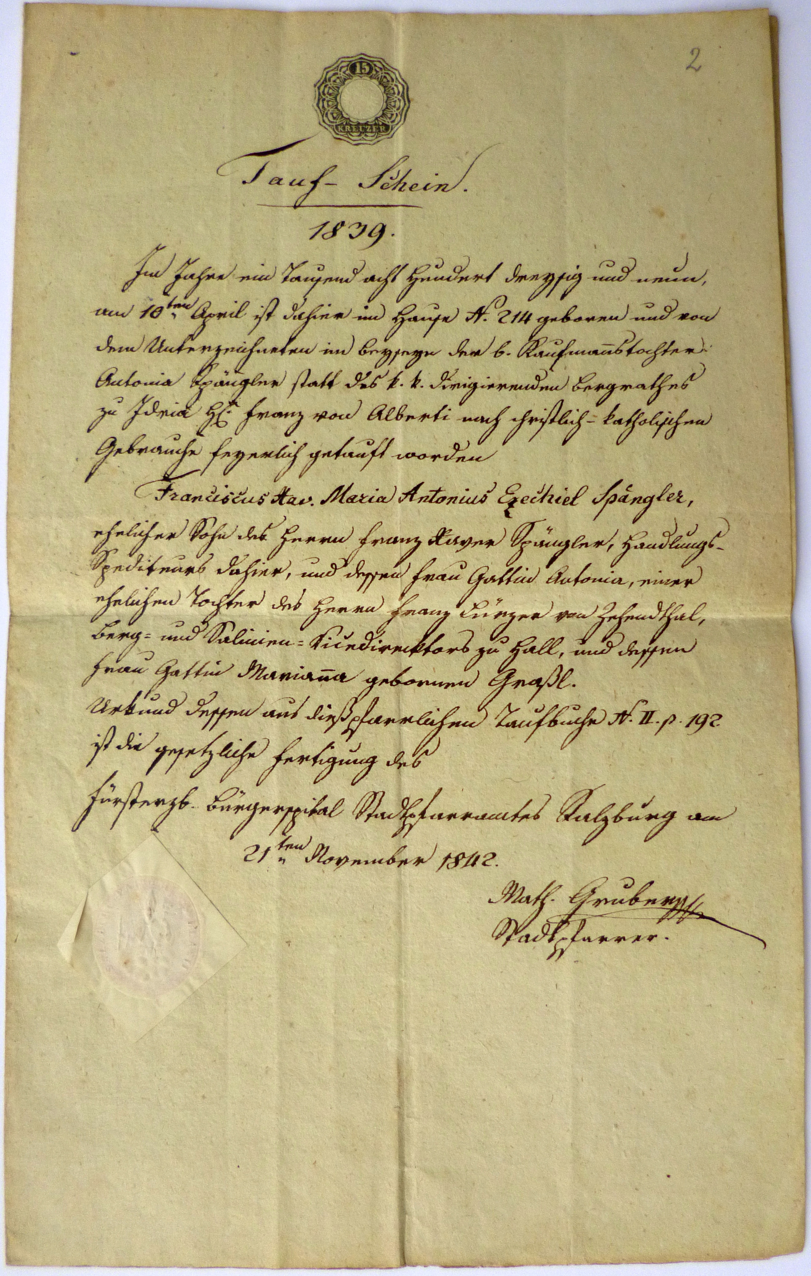 - Taufschein für Franz Spängler, 1839, Abschrift 1842