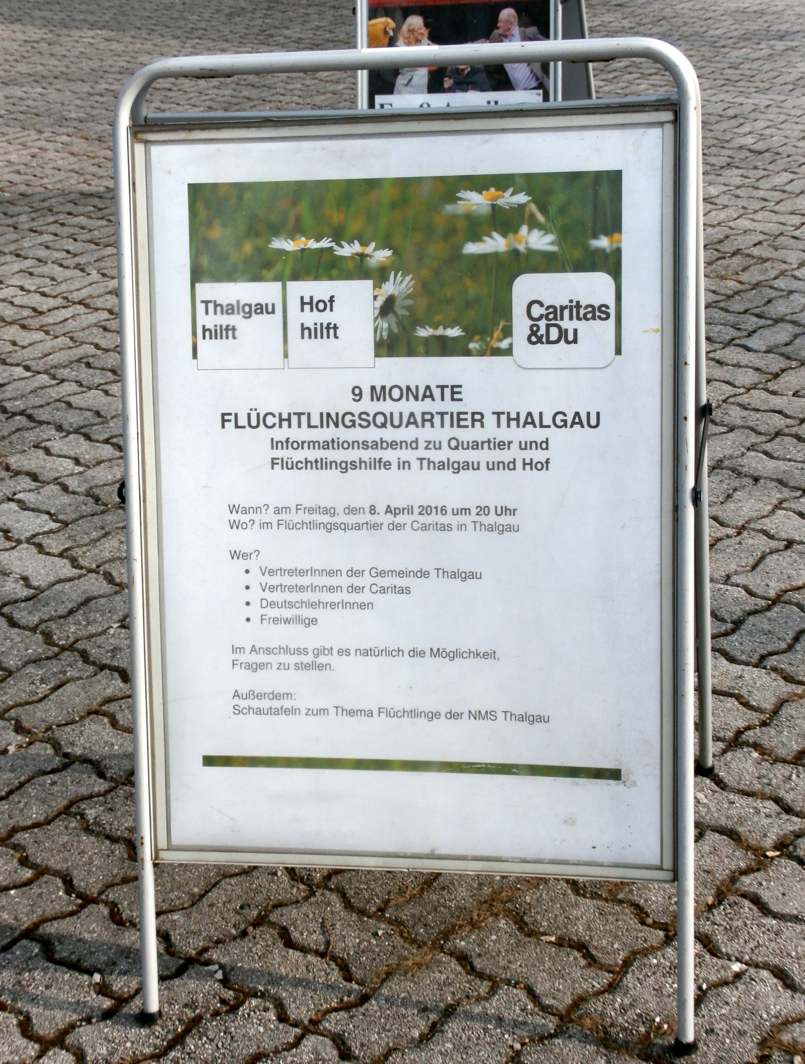 - Thalgau hilft, Bilanz nach neun Monate Flüchtlingsheim Thalgau, Plakatständer in Thalgau (März 2016)