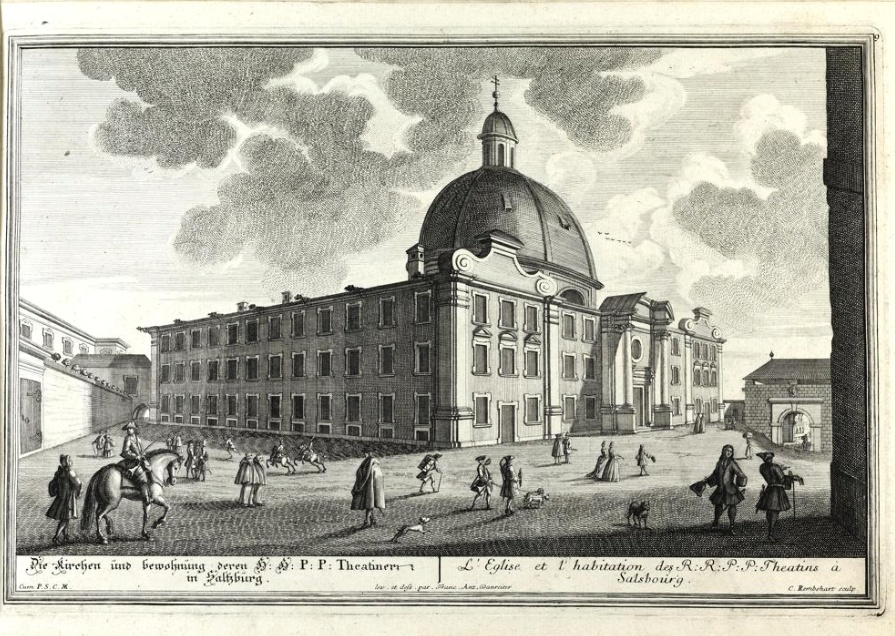 - Theatinerkloster: "Die Kirchen und bewohnung deren H: H: P: P: Theatinern in Saltzburg". Druckgrafik Blattmaß: 25,4 x 36,5 cm : schwarz-weiß, Stecher: Remshard, Karl [1678-1735], Drucker: Pfeffel, Johann Andreas [1674-1748].