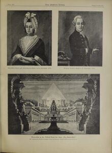 Das Bild links oben zeigt Anna Maria Mozart im 54. Lebensjahr, die Mutter des Wolfgang Amadé Mozart, den man auf dem rechten Bild im 21. Lebensjahr sieht. Darunter ein Bild der Schlussszene der Oper "Die Zauberflöte". Abgedruckt 1891.