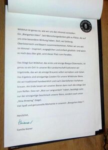 Am Stiegl-Gut Wildshut wird der Grundsatz "vom Feld ins Glas" verfolgt. Dies bedeutet, dass sämtliche Rohprodukte wie Getreide und Malz oder Hopfen aus der selben Hand stammen und alle Herstellungsschritte nachverfolgbar sind. Dabei wird Wert auf die Rekultivierung alter Getreidesorten wie Emmer oder Einkorn gelegt. Das Biergut wird familiär geführt und hat sich dem Nachhaltigkeitsgedanken verschrieben.