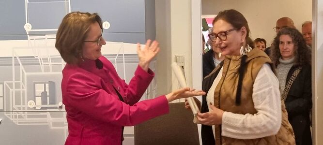Bild 1: Mai 2025. Hofrätin Lucia Luidold bei der Überreichung der Ehrenurkunde an Ingrid Weese-Weydemann.