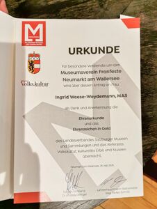 Anlässlich der Eröffnung des Kunstobjekt "Out of the box" am 25. Mai 2025 in Neumarkt am Wallersee überreichte Hofrätin Mag.a[3] phil. Dr. phil. Lucia Luidold, Leiterin des Referats 2/08 Volkskultur, kulturelles Erbe und Museen im Amt der Salzburger Landesregierung der mit Ende Juni 2025 scheidenden Leiterin des Museums Fronfeste Ingrid Weese-Weydemann als Dank und Anerkennung für besondere Verdienste um den Museumsverein Fronfeste in Neumarkt am Wallersee über dessen Antrag die Ehrenurkunde und das Ehrenzeichen in Gold des Landesverbands Salzburger Museen und Sammlungen und des Referats Volkskultur, kulturelles Erbe und Museen.