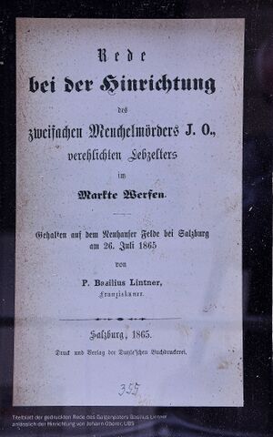 - Aimé Wouwermans: Der Lebzelter von Werfen (Johann Oberreiter). Nach den Ergebnissen der beim k. k. Landesgerichte in Salzburg wegen Meuchelmord durch Vergiftung durchgeführten Schlussverhandlung, 1865