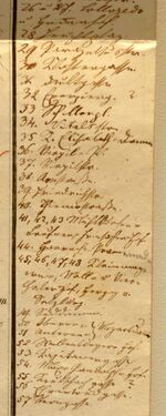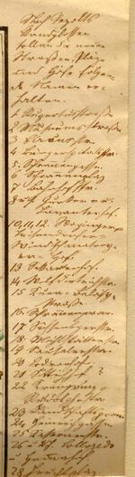29. Für die bisher nicht lesbare Bezeichnung von Nr. 3 im Stadtplan gibt es jetzt einen interessanten Vorschlag. Die Zahl "3" steht (wie die anderen Eintragungen handschriftlich) oberhalb des "D" und der 1 "Rupertusstraße (Verlängerung der Linzergasse)" und weiter unten zweimal an den Parkanlagen als Allee weitergeführt bis Nr. "15". Ich [O. H.] versuche jetzt eine Lesung "Circusstr.", wobei das "c" über einem anderen Buchstaben korrigiert scheint. Walter Schlegel schreibt mir dazu im März 2025 u. a.: Auf älteren Stadtplänen von Salzburg, aus etwa der ersten Hälfte des 19. Jahrhunderts, ist der rund um den Basteiengürtel führende Weg öfters als "Circumvallations Straße" bezeichnet. Das könnte bedeuten, dass die uns unleserliche Nr. 3 in Pezolts Straßenliste am Rand neben dem neuen Stadtentwicklungsplan "Circonstr." heißen könnte […] Es ist ja zusätzlich auffallend, dass dieser gekurvte Fahrweg aus dem Altbestand exakt in den Neubauplan übernommen wird.