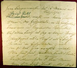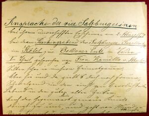 Salzburg d 6 July 186X // Euer Wohlgeboren. // Bisher hat mich die Sorge u. Unruhe um meine Frau nicht dazu kommen laßen, nun aber doch etwas beruhigendere Berichte einlaufen, sey es meine erste Pflicht, Ihnen für Ihre aufopfernde Freundlichkeit u. für Ihren Schutz meiner schwer kranken Frau u. unserer Kinder meinen wärmsten tiefgefühlten Dank auszusprechen. Möge der Himmel Ihnen lohnen, was Sie für meine Familie in dieser Bedrängnis gethan, und genehmigen Sie die Versicherung meiner / ausgezeichneten Hochachtung u. Wertschätzung // dero // ergebenster // Franz Zeller.[23]