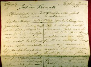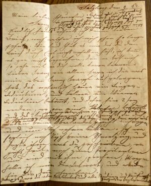 Problematisch wird es für jemand, der keine bzw. kaum Kenntnis von Salzburger Lokalitäten hat, und so ist etwa "Peterennental" im Brief vom 14. April 1861[7] , erste Seite unten, für mich nur mit Fragezeichen lesbar (wenn jemand die Lösung kennt, korrigiere ich gern). Soweit nur diese erste Seite dieses Briefes, die m. E. nur scheinbar "leicht lesbar" ist (man vergleiche dazu das Foto "Brief vom 14. April 1861, Seite 1"). – Auch an weiteren Stellen in diesem Brief (und in anderen, folgenden Briefen) versuche ist buchstabengetreu zu übertragen. Selten meine ich durch einen Buchstaben in eckigen Klammern verdeutlichen zu müssen, dass es nicht mein Tippfehler ist, sondern die Schreiberin auf diesen Buchstaben tatsächlich "verzichtet". Ab und zu muss ich einen Buchstaben ergänzen, der offenbar aus Flüchtigkeit fehlt, z. B. "Donner[s]bach" im Brief vom 25. und 26. Mai 1861.