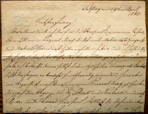 Salzburg den 24/5[9] // Meine inigst geliebten Theuren! // Da ich gestern Abends hörte das Herr Prälat Morgen nach Wien geht, ich schreibe daher gleich heute Früh und werde dan den Brief sogleich mit einen Stadtwapperl versehen hinein tragen und bitten das selben Euch zukomme. Eure theure Briefe habe ich alle 3 erhalten, und danke Euch das auch Ihr keine Gelegenheit unbenützt lasset, mir zu schreiben ist es doch eine unendliche beruhigung etwas von den Seinen zu hören. Dieser Tage, als am Pfingst Sontag, bekam Franz Spängler[10] wieder ein Reisen [?] Spatzenecker [Spatzenegger] glaubte schon wider er sey in einer Stunde Tod, aber er bekam die Anfälle 5 mahl war am 2 te[n] Tag nicht bey sich, aber Heute ist er schon wider ganz bey sich, sie schicken sogleich hinein, um die Gabriele aber heute ist sie schon wider hier, sie ist gestern mit der Marie gekommen, heute ist die Marie mit den Bauernbothen wider hinein, diese Anfälle könen sich oft noch widerhollen. Die Frau v Schmelzing ist nun wider einmal außer Bett, ist ihr aber dennoch nicht wohl. Er bath mich gestern Euch zu schreiben, das Ihr ja bey/ Gelegenheit, es widerrufet, das die Duscher so viel Vermögen hätten, es ist von allen dem nichts war was die Leute hier sagten wen sie 4 – bis 6 Tausend haben so ist es alles, ich weiß gar nicht wer dises so außgebreitet hat, ich sagte zu niemand was, es ist wegen der Pension für die Kinder. Ihr wißt schon, wie es die Leute bey uns machten.