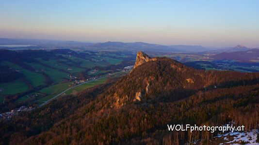 März 2019, Nockstein, links unten die Wolfgangsee Straße und ganz links im oberen Bildteil der Wallersee.