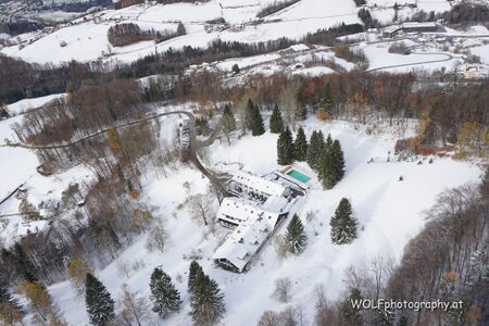 9. Dezember 2023. Links über dem Swimmingpool und über den Bäumen erkennt man im Wald noch den Schanzentisch und schräg rechts daneben den "Schiedsrichterturm" der ehemaligen Skisprungschanze.
