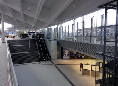 Die geschwungene Überdachung ist im Stil der Bahnsteigüberdachung des Hauptbahnhofs gehalten und insgesamt 120 Meter lang, an ihrer breitesten Stelle 25 Meter breit. Die Konstruktion steigt in Form einer Welle an und wird von sieben Stützen in "V-Form" getragen. Zu den Gleisen hin steht eine 130 Meter lange Lärmschutzwand aus Stahl und Glas. Für die Barrierefreiheit sorgt zudem ein moderner Personenlift von der Lastenstraße in die Passage.